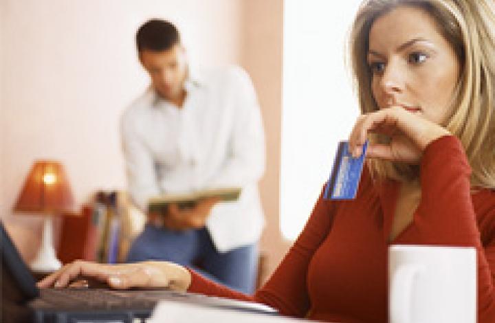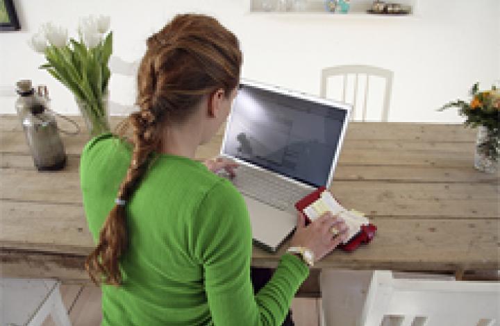 DAme som held i bankkort framfor pc - Klikk for stort bilde
