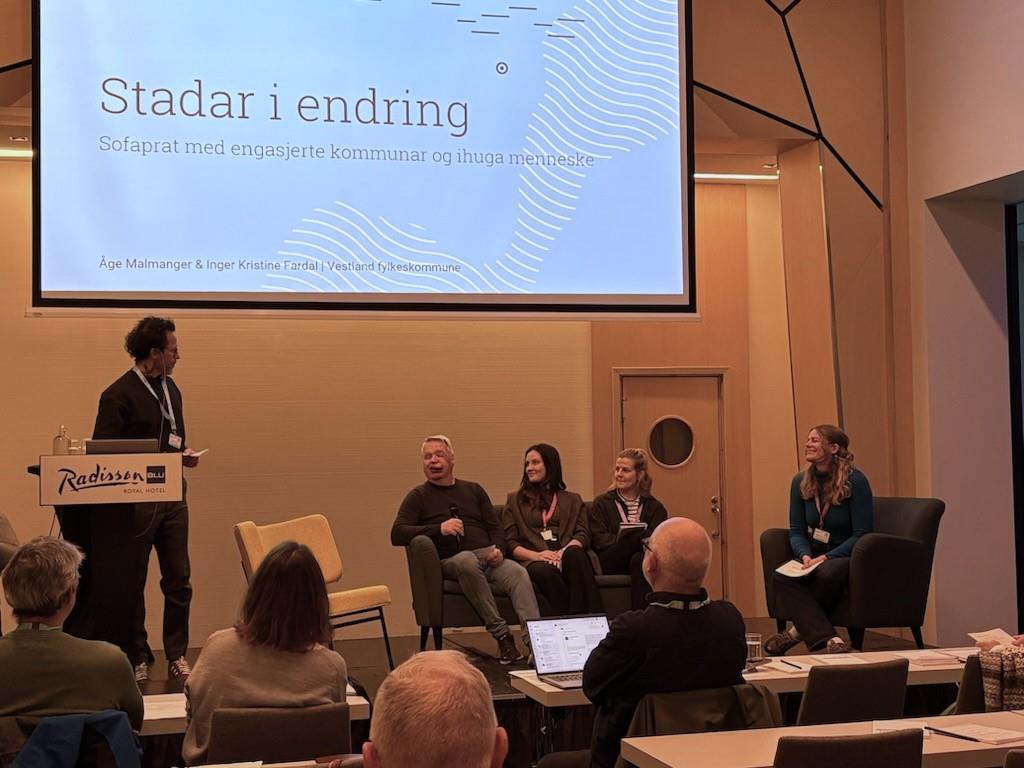 Kommunalsjefen deltok òg i ein sofaprat om «Stadar i endring – korleis skapar vi rom for det gode livet?». Her delte ho erfaringar frå plan, prosjekt og medverkningsarbeid med føremål å skape levande møteplassar. Mange av kommunane på Vestland står i eit krevjande utfordringsbilete, herunder også Etne kommune: me blir fleire eldre, færre i yrkesaktiv alder, og opplever ei nedgang i folketalet.