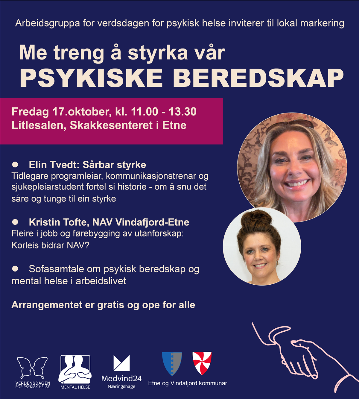 Arrangementet er eit samarbeid mellom Etne og Vindafjord mental helse, Medvind24 og psykisk helse og rustenester i kommunane